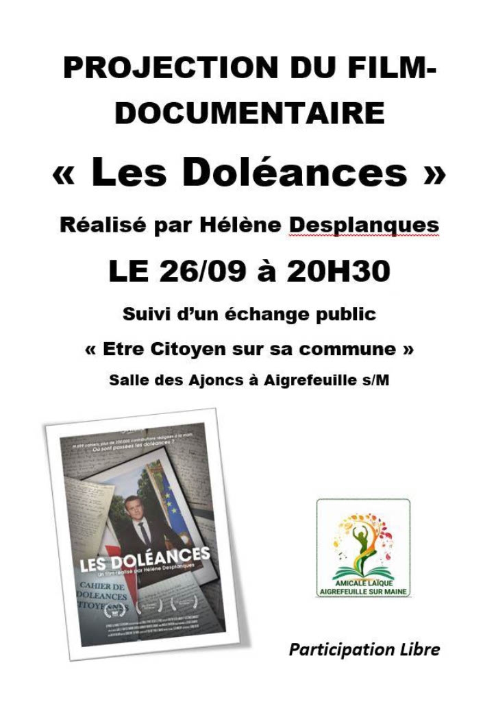 L'Amicale laïque d'Aigrefeuille organise le 26 septembre à 20 h 30 à la salle des Ajoncs la projection du documentaire "Les Doléances". Cette projection sera ensuite suivi d'échanges autour du thème "être citoyen sur sa commune.